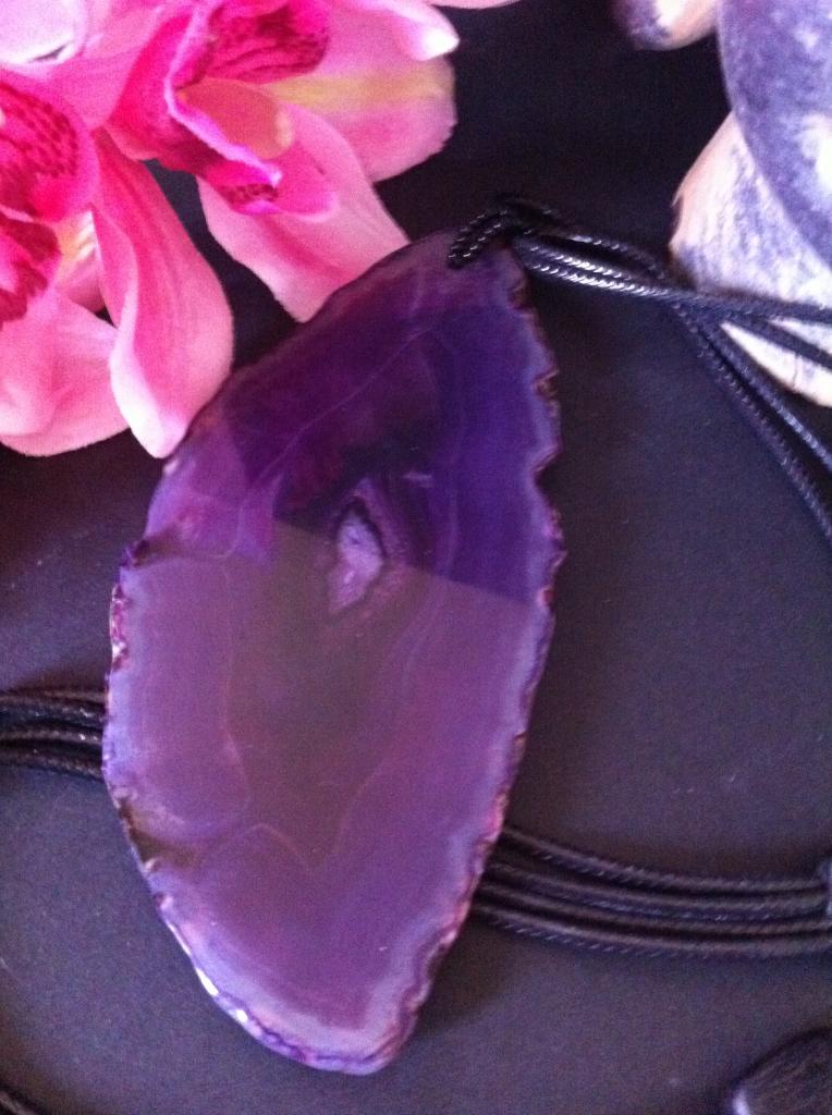 Tranche d'Agate Violette montée sur cordon triple façon cuir noir coulissant et règlable.